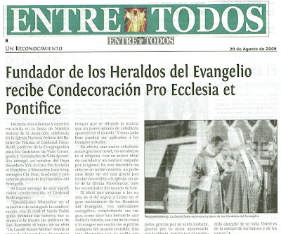 El quincenario “Entre Todos” órgano oficial de la Arquidiócesis de Montevideo, en su edición del 29 de agosto, publicó con destaque la noticia de la condecoración Pro Ecclesia et Pontifice, otorgada por el Papa Benedicto XVI a Monseñor Joao Clá Dias EP, fundador de los Heraldos del Evangelio.